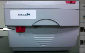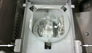 - To open the overhead projector, locate the buttons on either side of the projector, identified in the picture below. Press both buttons at the same time and remove the top of the projector.
