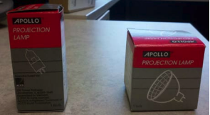- If the overhead projector in the room does not have this capability or both bulbs are burnt out, additional bulbs can be located in any of the supply closets on location. They are located in boxes that will look like one of the two shown below.